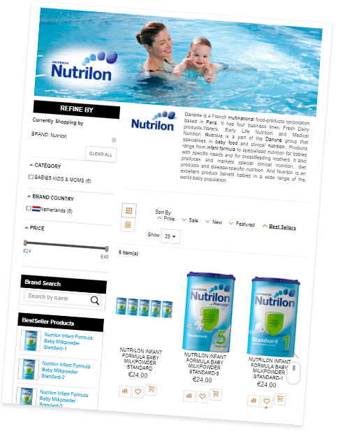 Displays featured brands Allows finding brands by category Allows filtering brands by alphabet